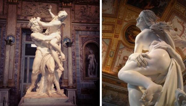 Il rapimento più antico e famoso che si conosca è quello di Plutone che rapisce Proserpina, per farne sua sposa nel regno dei morti. La madre, Cerere, vagò inutilmente sulla Terra alla ricerca della figlia; alla fine, si trovò un compromesso: Proserpina avrebbe trascorso sei mesi all’anno sulla Terra e sei mesi con Plutone negli Inferi. Questo spiega l’alternarsi delle stagioni: quando la figlia è sulla Terra, Cerere fa prosperare la natura, mentre l’inverno corrisponde al suo ritorno nel regno dei morti. Il mito celebra l’alternarsi delle stagioni, ma anche la possibilità di tornare alla vita dalla morte. Storia romantica? No, è uno stupro, ma noi nelle tante opere che la rappresentano apprezziamo solo il grande talento dell’artista che l’ha scolpita.