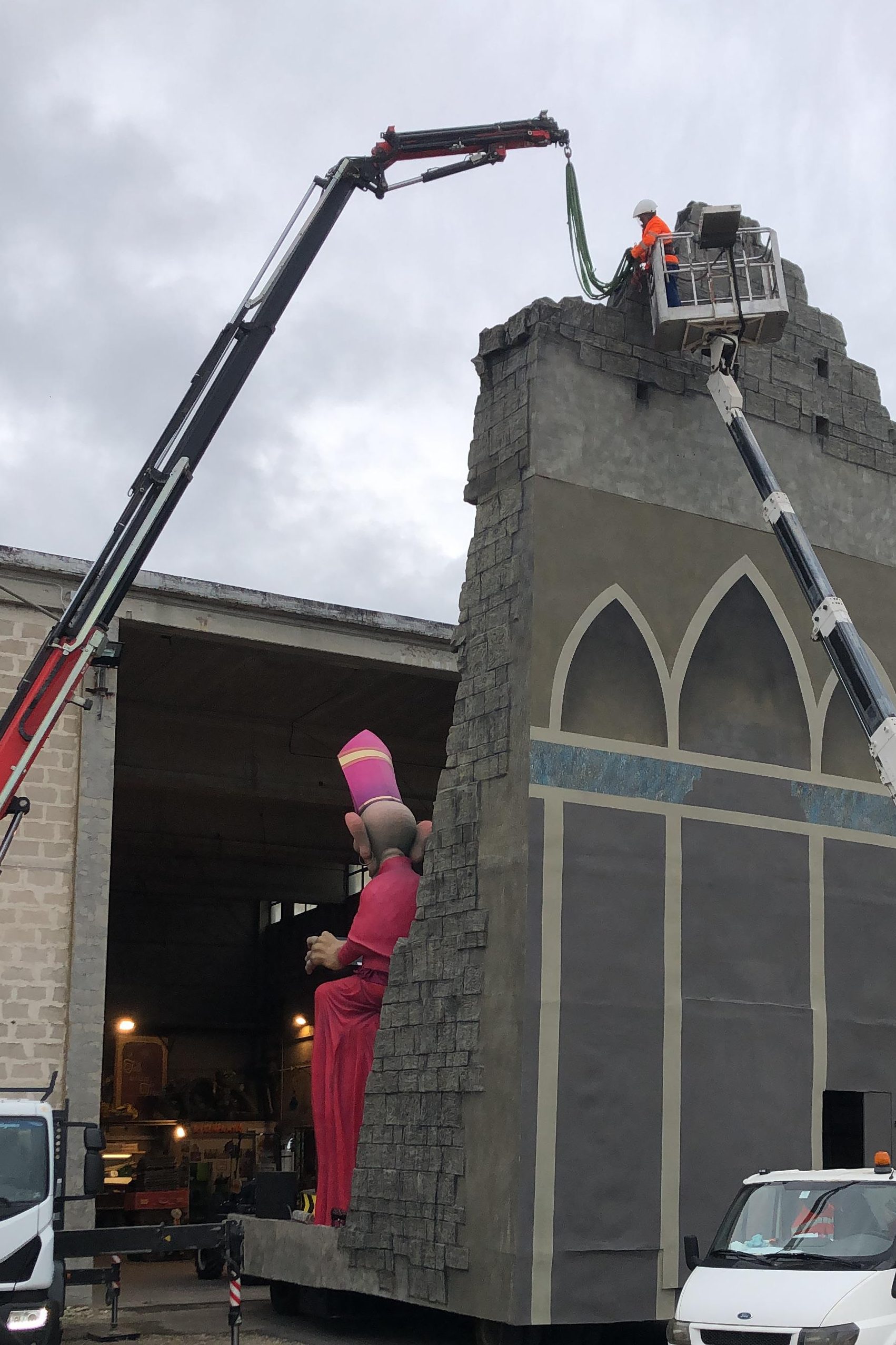 La costruzione dei carri in cartapesta richiede tempo, competenze scultoree e diverse fasi operative. Il punto di partenza è la modellazione in creta, che consente di definire proporzioni e particolari plastici. Su questa forma si realizza in seguito uno stampo in gesso: il materiale viene colato sul modello e, una volta solidificato, genera una matrice che ne conserva fedelmente i volumi. A questo punto, si procede con l’applicazione della carta. Vengono utilizzati fogli di quotidiano specifici, scelti per leggerezza e buona capacità di assorbimento della colla, tradizionalmente ottenuta mescolando acqua e farina. Le strisce di carta, sovrapposte in più strati, sono fatte aderire allo stampo precedentemente oliato, in modo tale da far rimuovere facilmente la forma una volta asciutta. Attraverso la sovrapposizione dei fogli, l’artigiano o l’artigiana ricostruisce la figura, che riprende l’aspetto del modello originario. Per aumentare robustezza e stabilità, la superficie viene rinforzata con carta cemento. Infine, avviene la decorazione pittorica, aggiungendo colori, sfumature e dettagli cromatici.
