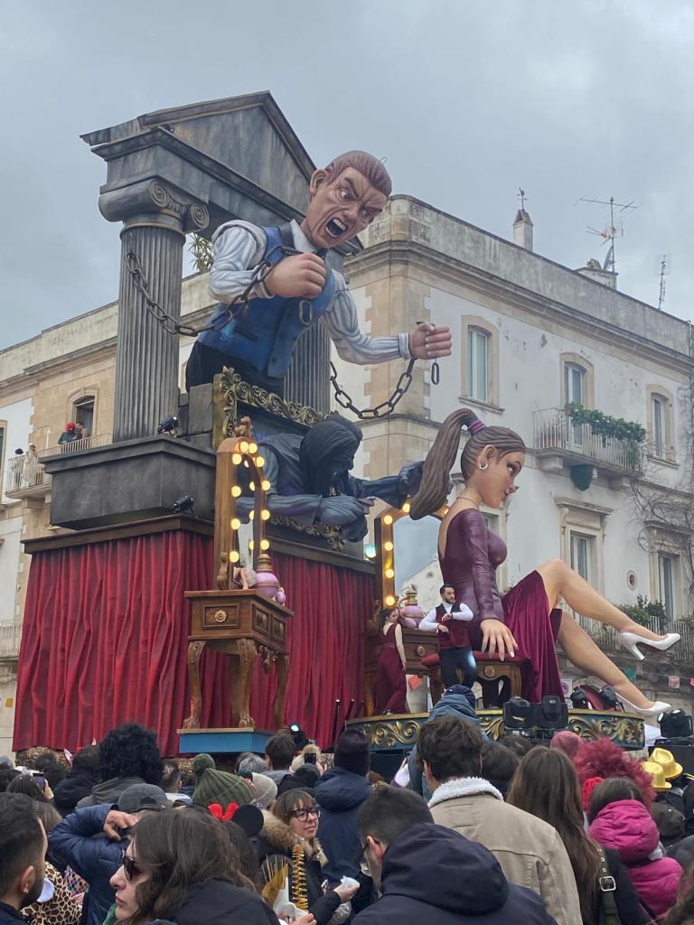 Per la prima volta il Carnevale di Putignano non si mostra indifferente dinanzi a una delle problematiche più radicate all’interno della nostra società: il patriarcato. La costruzione allegorica del carro Lo strano caso dell’uomo che diceva di amare materializza il fenomeno della violenza maschile contro le donne attraverso un’immagine intensa e subito percepibile e suggestiva. La riflessione è immediata, ogni dettaglio racconta una dinamica di potere che, seppur in una società che si dichiara moderna e libera, trova ancora oggi legittimazione.