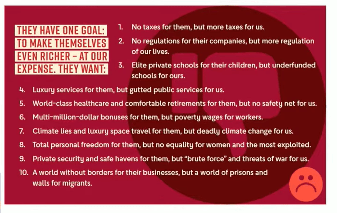 Secondo quanto individuato dalla campagna realizzata dal sindacalismo internazionale, le determinanti del sovvertimento statale in atto sarebbero riassumibili in dieci punti principali: l’eliminazione della tassazione per i ricchi — ma non per i lavoratori e le lavoratrici —; la cancellazione della regolamentazione volta a disciplinare il potere delle aziende multinazionali digitali; la valorizzazione dell’istruzione privata a scapito di quella pubblica; la decurtazione dei servizi pubblici e sanitari; l’indebolimento dei salari dei/delle lavoratrici e il parallelo aumento dei bonus per i multi milionari; la demonizzazione delle politiche per il clima; l’assolutismo delle libertà individuali; l’appropriazione di paradisi fiscali e la sistemazione di muri e prigioni per i/le migranti ma non per i loro affari. Nell’ottica trumpiana, i privilegi derivati dai modelli di welfare sociale basati sulla tassazione pubblica per offrire servizi a quante più persone possibili devono essere smantellati in favore della competitività.