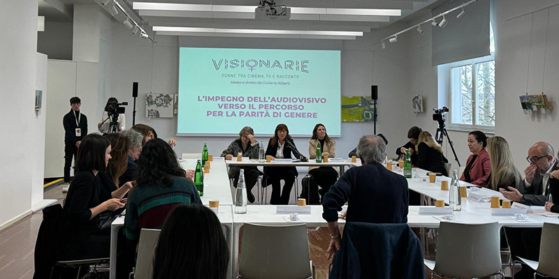 In copertina: inizio del panel “L’impegno dell’audiovisivo verso il percorso per la parità di genere”.