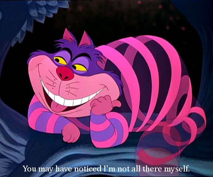 Così il “gatto” schrödingeriano della “culla” — ricordo che in molti paesi il Ripiglino è chiamato “Culla del gatto” — potrebbe benissimo esistere in una delle 7 dimensioni compattificate dell’universo a 11 dimensioni, magari nell’universo di “Alice nel Paese delle Meraviglie” e potrebbe manifestarsi, se ne ha voglia, come Cheshire Cat (Stregatto) o solo con un sorriso enigmatico (Alice nel Paese delle Meraviglie – Lo Stregatto (Doppiaggio Fandub ita by Aeffe87).