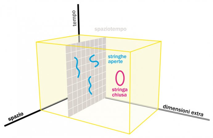 Alcuni modelli cosmologici derivati dalla teoria delle stringhe, come la teoria delle Brane, suggeriscono che il nostro universo non sia altro che una “brana” tridimensionale fluttuante in un universo a più alta dimensionalità, il “bulk”. La parola “brana” deriva da “membrana” ed è una generalizzazione geometrica. Mentre una stringa è un oggetto unidimensionale, una D-brana è un oggetto che ha D dimensioni spaziali: una D0-brana è un punto; una D1-brana è una stringa e una D2-brana è una membrana. La teoria del mondo-brana ipotizza che il nostro universo quadridimensionale (le tre dimensioni spaziali più il tempo) non sia altro che una D3-brana immersa in uno spazio più grande e con più dimensioni, chiamato “bulk” (il “grosso”). Secondo il punto chiave della teoria delle brane, le particelle che compongono il nostro universo (quark, elettroni, bosoni, ecc.) sono le estremità di stringhe aperte che sono “ancorate” alla nostra brana.