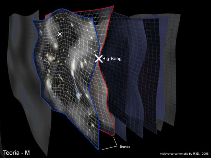 In base a questa teoria anche l’origine dell’universo viene reinterpretata. Supponiamo che tutto il nostro universo sia come un foglietto di carta (una brana con 3 dimensioni spaziali + 1 temporale) che galleggia e vibra nel bulk. Nel bulk esistono altre brane, come fogli paralleli, che fluttuano e vibrano vicino alla nostra e ogni brana può contenere un universo diverso, con le sue leggi fisiche. Le brane possono avere più dimensioni: la nostra sarebbe una D3-brana.
