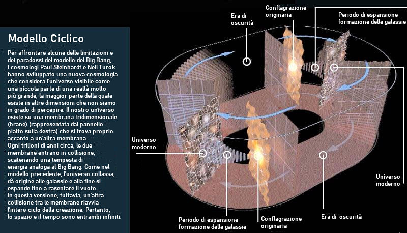 Ora immaginiamo che due di questi fogli si avvicinino e collidano (questa collisione è chiamata Big Splat). Quando le brane si scontrano, liberano un’energia enorme, come una gigantesca esplosione cosmica, che dà origine al nostro universo. Il Big Bang non è l’inizio assoluto, ma l’effetto di uno schianto tra brane. Secondo questa teoria (detta modello ecpirotico), il nostro universo nasce da una collisione ciclica: le brane si avvicinano, si scontrano, si allontanano e poi tornano a collidere.