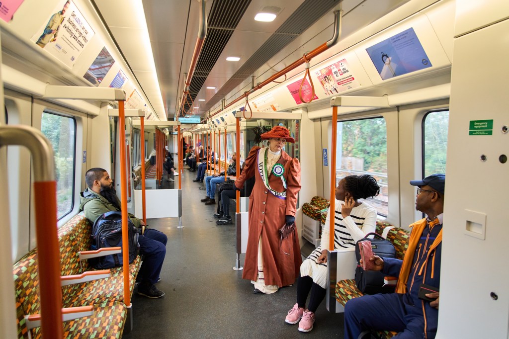 Attrice travestita da suffragetta a bordo della London Overground per l’inaugurazione del nuovo nome “Suffragette Line”