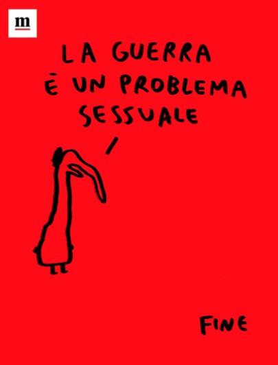 «La guerra è un problema sessuale» dicono Maicol & Mirco nella loro vignetta per l’8 marzo sul Manifesto. Sono giorni che tento di scrivere che «La guerra la fanno e la vogliono gli uomini» per farmi pubblicare questa convinzione, che credo inattaccabile, e poterne parlare con qualcuna/o e mettere in discussione verità indicibili soprattutto con gli uomini. È una cosa che voglio dire da quando la guerra è scoppiata in Ucraina, da allora ho provato a dirlo a “Prima Pagina”, ma a Radio3 non mi hanno mai fatta intervenire. Credo ci sia un legame profondo tra la vignetta e la mia frase. Un bel filo rosso che lega guerra e sesso, ma quello maschile, anche se i due non lo dicono.