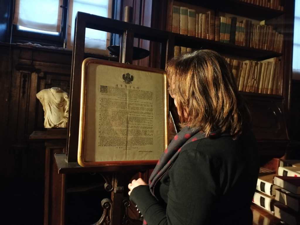 Spostando lo sguardo sugli scaffali, Rita Tartiviti ce ne ha descritto i particolari: alti otto metri, realizzati in legno di noce e dotati di ante che fungono da veri e propri scaffali di libri. Per preservare i volumi, la Sala non è dotata di riscaldamento né di illuminazione elettrica, mantenendo un microclima naturale. Dopo un restauro che ha rimosso ogni traccia di polvere dai volumi, la sala apre solo per eventi speciali e visite guidate, durante le quali gli esperti operano con guanti e schermature solari per proteggere la carta secolare.