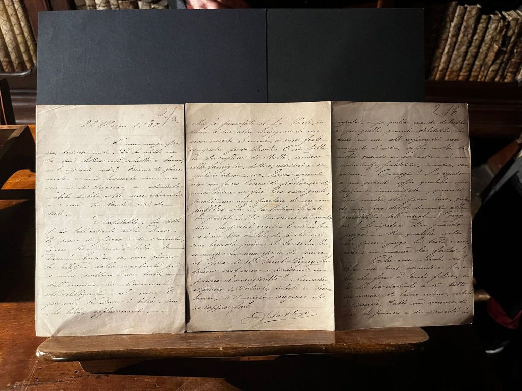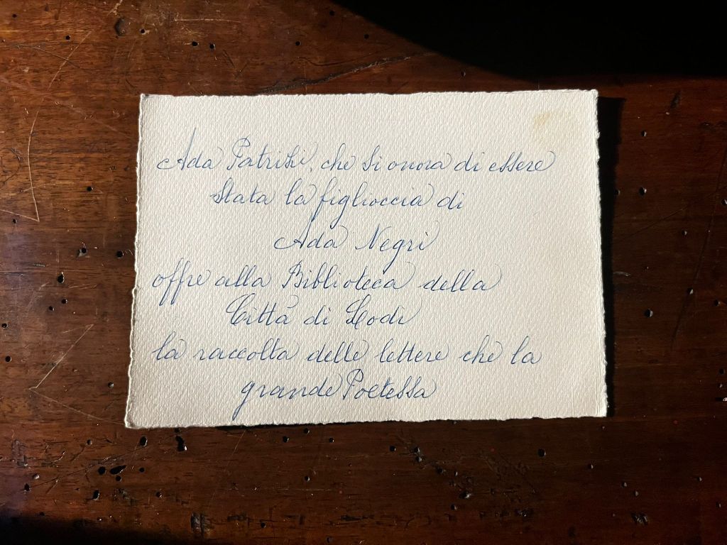 Infine, il percorso si è concluso con l’omaggio alla scrittrice lodigiana Ada Negri, della quale la biblioteca conserva un ricco fondo di lettere e cartoline, ritagli di giornale. Molto attiva nel sociale, fu una delle fondatrici dell’Unione nazionale femminile e la prima donna a essere ammessa nella Accademia Nazionale (culturale), risalente al periodo del fascismo. La bibliotecaria ha avuto così la premura di renderci partecipi di una di queste lettere, firmata Ada Negri, facente parte del Fondo Corrispondenza Ada Negri-Ettore Patrizi, datata 22 maggio 1892, e di una cartolina che attesta un passaggio di possesso delle sue opere, recitando «Ada Patrizi, che si onora di essere stata la figlioccia di Ada Negri, offre alla biblioteca della città di Lodi la raccolta delle lettere che la grande poetessa inviò allo zio Ettore Patrizi attraverso una lunga affettuosa amicizia».