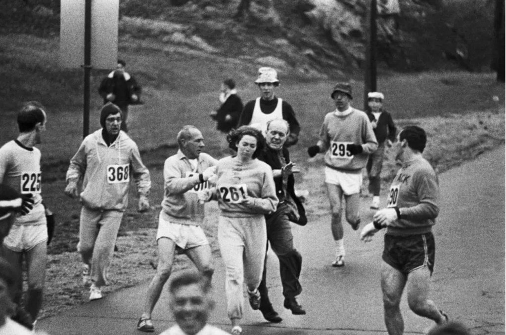 Kathrine Switzer riuscì a correre la maratona di Boston nel 1967, allora riservata agli uomini, iscrivendosi con le iniziali. È diventata iconica l’immagine in cui viene strattonata e quasi espulsa dalla gara.