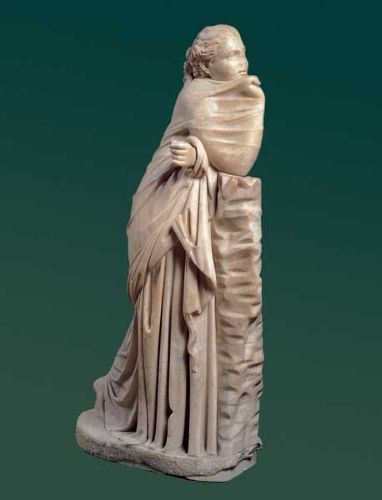 Tra i ritratti imperiali spicca quello di Agrippina Minore, nelle vesti di orante. Qui cambia tutto: non più moglie anonima, ma donna dentro il potere imperiale. Agrippina, moglie dell’imperatore Claudio e madre di Nerone, riuscì nell’intento di porre sul trono il figlio. Una volta salito al trono, Nerone, a causa di alcuni dissidi insorti con la madre, cercò più volte di assassinarla, riuscendo nel suo intento nel 59 d.C., per mano di un sicario. Significativi sono la postura, che esprime controllo, compostezza, autorità, e l’abbigliamento che denota lo status. Il suo volto, severo e determinato, è incorniciato da piccoli riccioli. Eppure, il suo ruolo è definito da relazioni: madre, moglie, dinastia. Il femminile entra nella storia ufficiale, ma attraverso il potere maschile, è il “potere attraversato”. Agrippina è potente, ma il suo potere deriva dalle relazioni familiari. Il corpo femminile imperiale è visibile, autorevole, ma inscritto in una rete patriarcale.