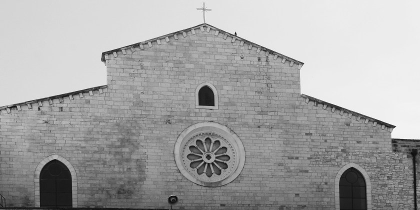 La Chiesa di San Domenico si affaccia su una piccola piazza ed è un luogo in cui convivono architettura religiosa e vita quotidiana, con il vicino Mercato Comunale. Il prospetto in pietra, segnato dal portale rinascimentale e dall’ampia finestra superiore, conserva l’impianto sobrio dell’edificio storico, mentre la piazzetta antistante continua a essere un luogo di incontro nel centro