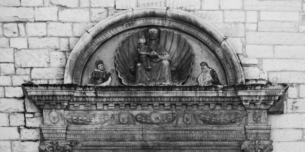 Il portale della Chiesa di San Domenico, realizzato nel 1510 in stile rinascimentale, conserva un ricco apparato scultoreo sia decorativo che simbolico. Nella lunetta superiore è raffigurata la Vergine con il Bambino entro una conchiglia, elemento iconografico tipico del periodo, affiancata da figure di santi. L’architrave e le cornici presentano motivi ornamentali e teste angeliche scolpite nella pietra