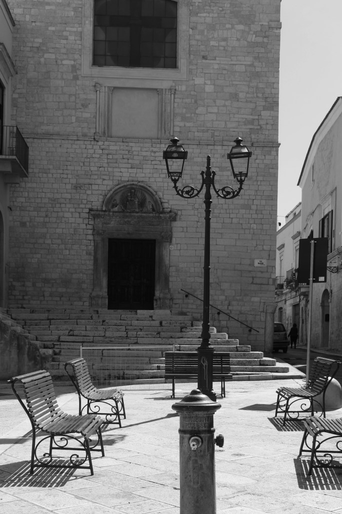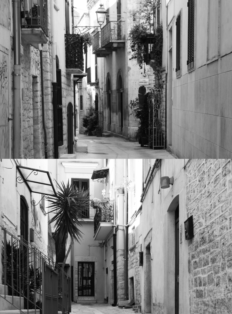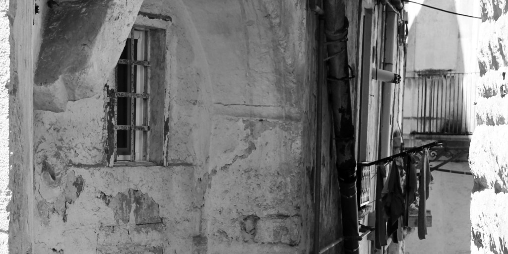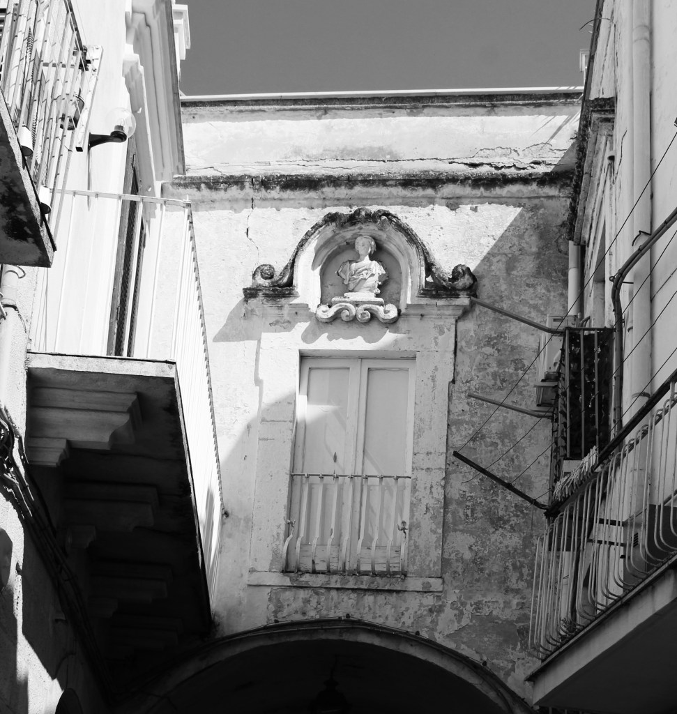 Scorcio del centro antico di Andria: qui i vicoli stretti, gli archi e le facciate consumate dal tempo restituiscono il carattere più autentico della città storica, fatto anche da superfici irregolari e piccole finestre protette da inferriate