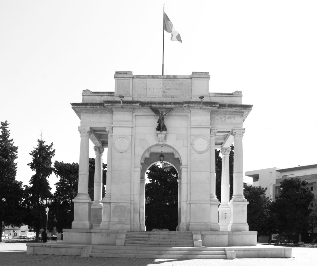 Realizzato nel Novecento, si configura come un tempietto civile in pietra chiara con colonne, arco centrale e apparato scultoreo celebrativo. Sulla sommità è presente una bandiera, che restituisce un’idea di appartenenza locale e nazionale