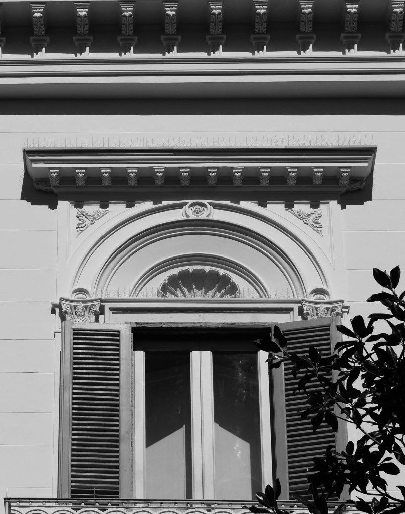 Dettaglio di un edificio storico dove la finestra è incorniciata da modanature,