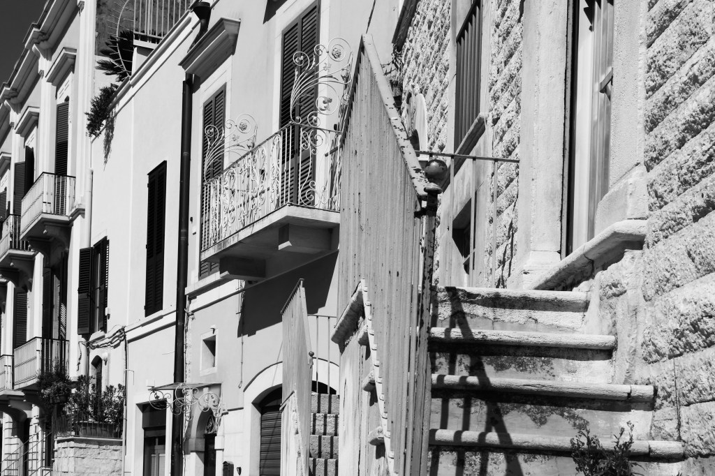 Scorcio urbano di Andria in cui scale esterne, balconi in ferro battuto e facciate in pietra mostrano l’evoluzione dell’abitare nel centro cittadino. Accanto agli elementi costruttivi più antichi convivono interventi successivi e dettagli decorativi novecenteschi che però non perdono il legame con la struttura originaria