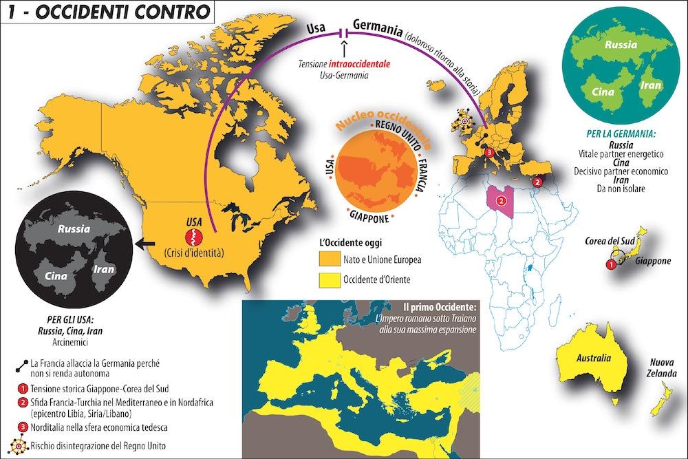 L’editoriale del direttore, La parte che volle farsi tutto, ricco come sempre di riferimenti storici e scritto con il suo stile inconfondibile, affronta parte dei temi trattati e sottolinea come la vocazione universalistica dell’Occidente abbia rappresentato nella storia sia la sua forza che il suo limite. L’Occidente in Europa è sempre stato filoamericano. «Noi europei, che per e di potenza siamo vissuti fino alla metà del secolo scorso, ci siamo adattati da tre generazioni al microclima regolato dal superiore americano. Temperato, per molti dolce, dal retrosapore narcotizzante», scrive Caracciolo. Occidenti contro sta a significare che nella molto allargata famiglia occidentale (Nato e Ue, il centro dell’impero americano) non ci si ama più come una volta e che Francia e Germania si trovano strette in un’Unione Europea che sembra essere stata un po’ dimenticata dagli Usa. Ma Occidenti sono anche il Giappone, la Corea del Sud e i Five Eyes: Australia, Nuova Zelanda, Gran Bretagna, Canada e Stati Uniti, i Paesi con i centri spionistici più grandi al mondo. Diego Fabbri ricorda che l’Occidente è invenzione recente. «Gli antichi mai usarono l’espressione per indicare la cultura di cui erano portatori. Tuttora risulta impossibile stabilirne le frontiere, individuare i fenomeni che ne costituiscono la fibra, oppure indicare quale nazione abbia concretamente distillato il concetto corrente – con Francia, Regno Unito e Stati Uniti a contendersi il primato. Il grande storico greco Erodoto riconosceva Europa e Oriente come poli geografici ma non utilizzava europeo/i come sostantivo, tantomeno occidentale/i, né descriveva il continente come omogeneo». Un’intervista al professor Munker ci fa riflettere sulla «Germania in movimento», ottimamente illustrata dalla cartina di Laura Canali, che evidenzia l’influenza tedesca nel Nord del nostro Paese. Un altro articolo molto interessante di questa sezione è quello sul Papa antiamericano, Bergoglio. Un Papa che sfida gli Usa, corteggiati da Woytila e Ratzinger in passato, e che rappresenta il perfetto starring sparring partner di Donald Trump; un papa che mette in atto una vera rivoluzione, «con l’avvio di un rivolgimento geografico, che include uno stravolgimento, anche ideologico, nell’assetto del collegio cardinalizio e una redistribuzione, da Nord a Sud, da Ovest a Est, del potere di eleggere il papa. Geopolitica pura, sostanziale, che prevale sull’istanza giuspubblicistica di riforma, tuttora incompiuta, della curia.» E costituisce il lascito più consistente di «Francisco da Baires», rendendolo il primo pontefice «globale», che rifiuta di incontrare Mike Pompeo ma non scomunica Chavez e dichiara, a proposito del sistema capitalistico americano: «E certo non possiamo aspettarci che il modello economico che è alla base di uno sviluppo iniquo e insostenibile risolva i nostri problemi. Non l’ha fatto e non lo farà, perché non può farlo, anche se certi falsi profeti continuano a promettere l’effetto a cascata che non arriva mai». Un papa che alla fraternità, di matrice illuministica, ha preferito la fratellanza universale, di matrice abramitica, e ha imbracciato «il vessillo dell’amicizia sociale, più affine all’ideale confuciano, sinico, dialogico e coesivo dell’armonia, che al modello nostrano, critico, dialettico e competitivo della democrazia».