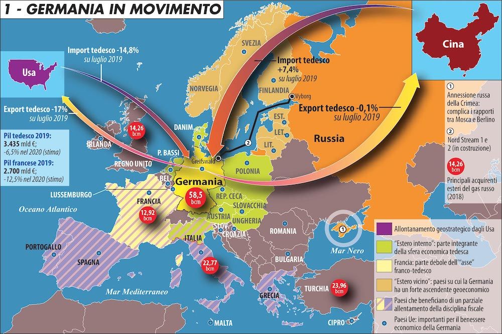 La Parte Seconda del numero 9 di “Limes” si occupa della Germania con ben nove articoli, come sempre scritti da persone con diverse formazioni e visioni del mondo. Prende in esame lo Stato più popoloso dell’Unione Europea (80 milioni di abitanti), osservato speciale dagli Usa dopo le due guerre mondiali, ben poco pericoloso oggi dal punto di vista militare ma fortissimo sul piano economico e commerciale. Vengono studiati i suoi rapporti con i due nemici storici degli Usa: la Cina, indispensabile partner commerciale, e la Russia, con cui, dopo la scelta di rinunciare al nucleare, in seguito alla tragedia di Fukushima, il Paese della Kultur versus la Zivilisation, ricco di carbone troppo inquinante, sta perfezionando il Gasdotto Nordstream 2. Anche nei confronti dell’Iran la politica estera di Merkel non è di ostilità, diversamente da quanto accade alla potenza egemone mondiale, gli Usa. Ma la Germania non è l’unica disobbediente in Unione Europea. Anche l’Italia si è mossa autonomamente sottoscrivendo, in occasione della visita in Italia di Xi Jinping, un Memorandum con la Cina. Gli Usa, che sembrano averci un po’ abbandonati perché impegnati nella battaglia intrapresa contro il nuovo nemico cinese e nell’osservazione dell’ex nemico storico, ci tengono comunque sotto controllo, anche se in modo molto diverso rispetto ai tempi della Guerra fredda. Le mappe anche in questo caso sono fondamentali per capire i movimenti strategici, via terra e via mare, dell’unico Impero mondiale attualmente esistente, quello degli Usa e del gigante emergente che gli si contrappone, utilizzando sia il controllo degli Stretti, che i legami economici e commerciali e il percorso della Via della seta. Molto interessanti sono le mappe di Ordolandia e Caoslandia, intendendo per Ordolandia il vecchio Occidente, di cui siamo l’avanguardia, lasciata sola dai Paesi Ue, verso cui approdano i migranti e per Caoslandia l’Africa e l’area del Mediterraneo. Dovrà essere la Giovane Germania, nata solo nel 1990, «collazione di Germanie», Paese troppo piccolo per dominare l’Europa e troppo grande per essere come gli altri, a prendere in mano la mutata situazione geopolitica? Già lo ha fatto in occasione della pandemia preoccupandosi di proteggere finanziariamente durante il semestre tedesco in Ue i Paesi più fragili e più duramente colpiti dal contagio pandemico. Un intervento del terribile Schauble al Parlamento tedesco rimarca l’intenzione della Germania di assumersi l’egemonia dell’Unione Europea, di ricoprire un ruolo importante in politica estera, nonostante il tedesco medio sia in tutti questi anni diventato un Grande Svizzero, desideroso di tranquillità e di Stato sociale. Da leggere con attenzione anche gli approfondimenti sulla relazione tra il centrismo di Merkel e la nascita di AfD.