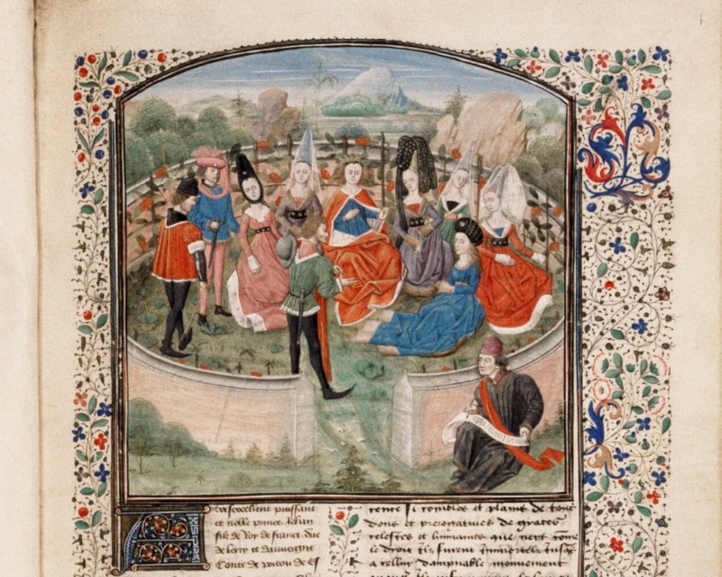 La compagnia dei giovani novellatori si riunisce nel giardino fiesolano intorno a Pampinea, regina della prima giornata; all’esterno del muro siede Boccaccio, intento a scrivere su un cartiglio