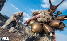 L’altra è terribile, spaventosa, misteriosa: il Mamuthone, ricoperto di pelli; sul volto ha una maschera di legno e sulla testa un fazzoletto annodato, salta di continuo e fa risuonare i 30-40 campanacci pesantissimi legati sulla schiena, con la funzione di scacciare il male. Le due antitetiche figure rappresentano chiaramente la luce e il buio, l’umano e il bestiale, che va tenuto sotto controllo. Personaggi con sembianze animali, che richiamano i bovini, si trovano anche a Orani; si tratta dei Bundhos, che portano grandi maschere di sughero ed emettono versi gutturali, lamentandosi per la morte della fertilità.