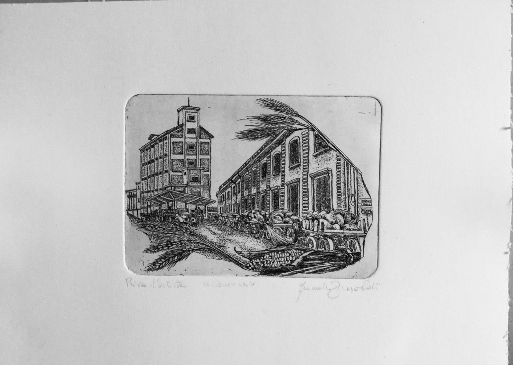 A un certo punto mi pongo l’interrogativo con quale tecnica disegnare questi frammenti di città e di paesaggio, sempre tenendo fede alla conquista del mio filo/segno. Venivo dalla pubblicità in cui le mie opere, anche un manifesto o un depliant, venivano riprodotte in molti esemplari. Avevo quindi l’idea di una forma di comunicazione di cui molti potevano usufruire a prezzi contenuti, quindi non artistica. Imparo, però, che gli unici prodotti riconosciuti come forma autentica di arte riprodotta in più esemplari è la stampa all’acquaforte. Solitamente la si impara nelle scuole d’arte, ma io, così come per la fotografia, non ho tempo di andare a scuola. Quindi per la fotografia utilizzo suggerimenti da parte di amici che mi insegnano anche a stampare le foto autonomamente, con l’allestimento della camera oscura. Per le acquaforti, vado in una stamperia a Milano che per qualche anno mi segue nella stampa delle lastre di zinco o rame, che io incido manualmente nello strato di vernice a base di cera e in seguito a bagni in acido appropriato corrosivo del metallo, mi permettono di ottenere, dopo una pulitura della lastra dalla vernice, la possibilità di stampare un certo numero di esemplari, naturalmente numerati e firmati da me a matita.