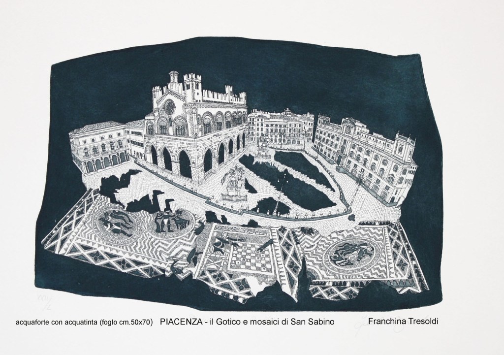 Nei primi anni ’70 vivevo in un attico a Lodi con mio marito, dove avevo una visione della città con tutti i suoi tetti di coppi e il Torrione, le chiese e i campanili. Vedo a un certo punto i tetti trasformati in drappi decorati di pizzi e disegni di tappeti. Mi viene in mente che gli arabi portano i loro tappeti di preghiera all’esterno delle case. Comincia da lì la passione di disegnare i centri storici soprattutto dall’alto, per avere i tetti su cui disegnare tappeti e merletti. Il primo disegno è appunto la vista della città dall’attico di via S. Bassiano.