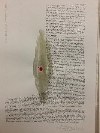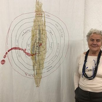 «Nel lenzuolo candido spicca, ricamata in oro, la forma della vulva da cui esce una scia di fili rossi, le macchie del sangue di vita. Tutto intorno, in una spirale che la circonda, parole: mistero, corpo, relazione, creazione, cielo stellato, dentro e fuori di noi, in un continuo rimando tra parole, corpo, arte» (Katia Ricci).