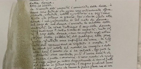 «Nato da donna, così è venuto Gesù. Non è apparso al mondo adulto, ma come ci ha detto il Vangelo, è stato concepito nel grembo, lì ha fatto sua la nostra umanità… La rinascita dell’umanità è cominciata dalla donna. Le donne sono fonti di vita. Eppure sono continuamente offese, picchiate, violentate, indotte a prostituirsi e a sopprimere la vita che portano in grembo. Ogni violenza inferta alla donna è una profanazione di Dio, nato da donna». Solo le artiste donne possono arrivare a certe coraggiose forme espressive; esiste un modo femminile di fare arte, diverso da quello maschile, anche se le donne per affermarlo stentano a trovare spazi, soprattutto se non seguono regole consolidate.