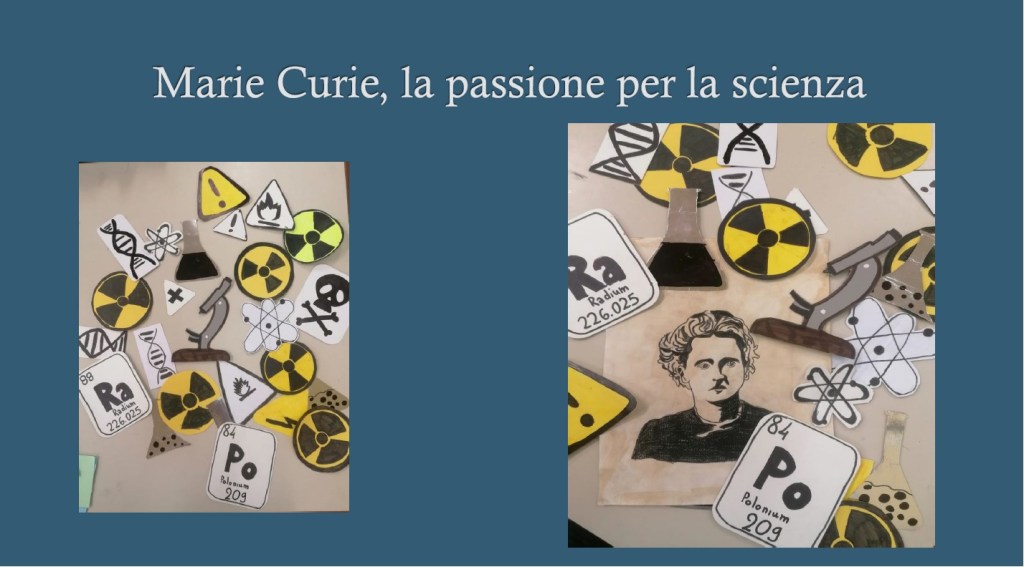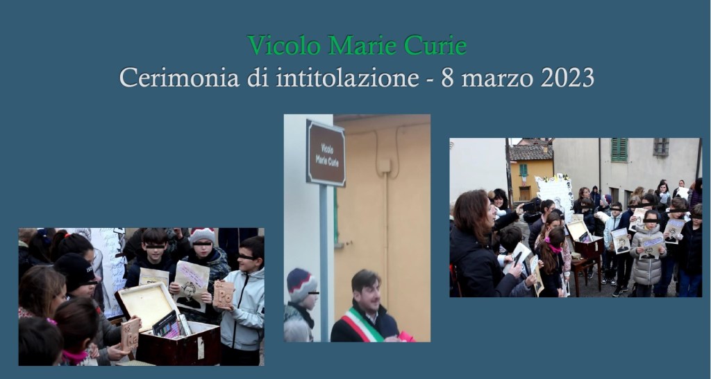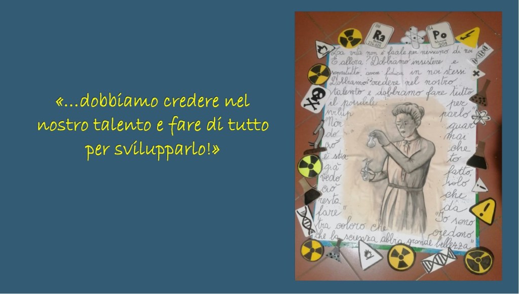 Questa la valutazione della giuria per il secondo lavoro: «Il progetto si qualifica come ottimo percorso interdisciplinare che in maniera motivante permette l’espressione creativa e coinvolge bambine e bambini nel proporsi come portatori di conoscenza alla cittadinanza. Il lavoro parte dalla lettura della biografia di Marie Curie e affronta il tema della parità di genere in campo scientifico; da questo si allarga all’analisi dei diritti delle donne negati nella storia e a una riflessione sulla contemporaneità di oggi in varie parti del mondo e sul quinto punto dell’Agenda 2030. Dalla lettura all’intitolazione, il percorso si è articolato attraverso la produzione di diversi manufatti e installazioni molto originali, quali il ritratto con matita a carboncino, la creazione di due mattonelle in terracotta coi simboli chimici degli elementi scoperti dalla scienziata, la valigia e il tavolo di lavoro di Marie Curie. Attraverso il disegno e la manipolazione, bambini e bambine si sono appropriate di conoscenze sperimentando tecniche e codici espressivi; allo stesso tempo hanno preparato in maniera eccellente e coinvolgente la cerimonia dell’intitolazione, sintesi esemplare di cittadinanza attiva. La documentazione mostra come la vita di Marie Curie abbia coinvolto gli/le alunne che si sono cimentate in una riscrittura della biografia della scienziata in prima persona. Inoltre, hanno riportato alcune sue frasi famose nell’intento di mostrare la loro attualità e la loro importanza nella promozione dei propri talenti da coltivare con studio e tenacia. La conclusione della presentazione multimediale, con l’elenco dei sogni di bambine e bambini per il proprio futuro, restituisce il valore del percorso come particolarmente formativo, non solo da un punto di vista civico, ma anche identitario».