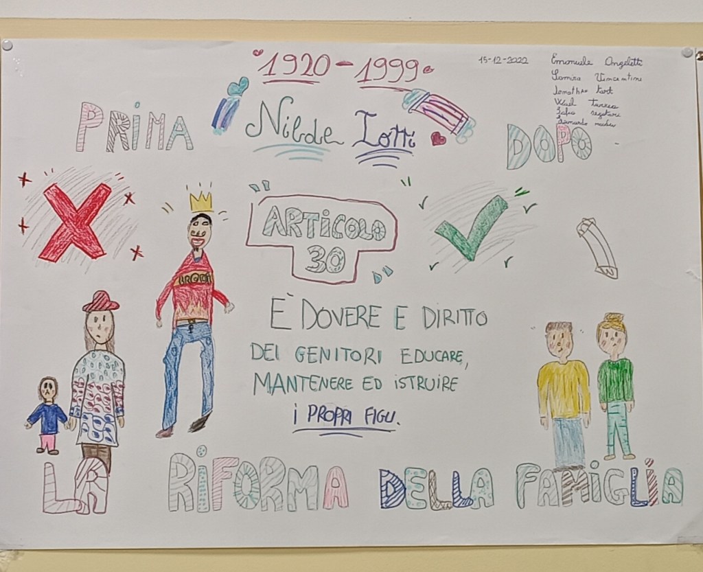 Con la collaborazione della sezione ANPI di Zagarolo, le classi hanno assistito a una lezione partecipata, a seguito della quale hanno prodotto dei cartelloni riguardanti tre Costituenti: Nilde Iotti, Angela Guidi Cingolani e Lina Merlin.