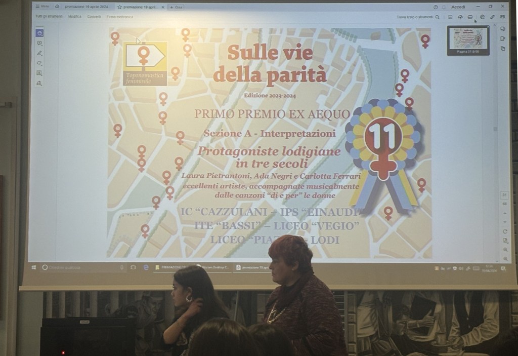 Con il loro progetto Protagoniste lodigiane in tre secoli: Laura Pietrantoni, Ada Negri e Carlotta Ferrari, eccellenti artiste, accompagnate musicalmente dalle canzoni “di e per” le donne, gli/le studenti si sono aggiudicati il I premio ex equo per la sezione A — Percorsi della XI edizione del concorso Sulle vie della parità, la cui premiazione si è tenuta il 19 aprile presso la facoltà di Scienze della Formazione dell’Università Roma Tre.