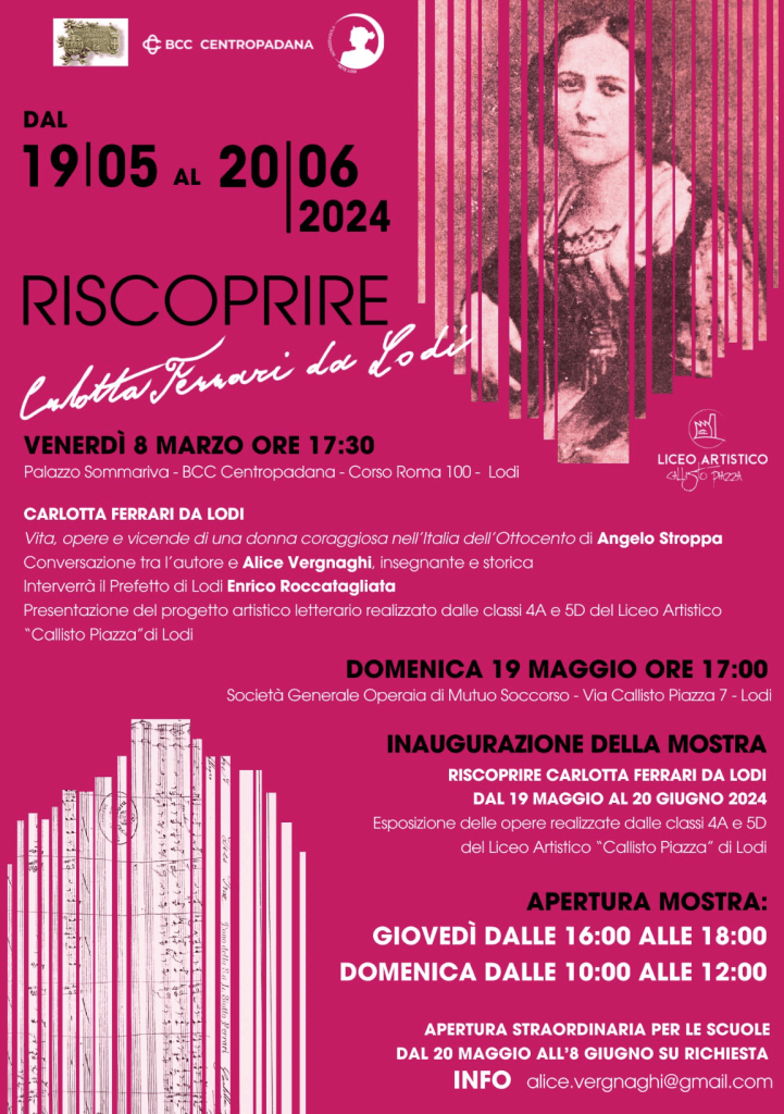 I percorsi artistici degli/delle ragazze del liceo artistico Callisto Piazza hanno portato alla creazione di opere esposte in occasione della mostra dedicata a Carlotta Ferrari, che si è tenuta presso i locali della Società Generale Operaia di Mutuo Soccorso di Lodi durante i mesi di maggio e giugno 2024.
