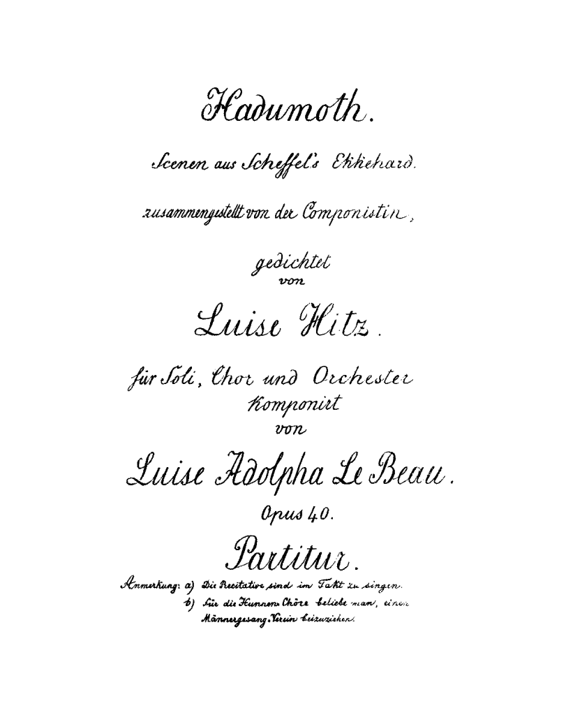 Nelle sue Memorie Luise Adolpha Le Beau ha riportato il personale dispiacere per gli anni vissuti a Wiesbaden, scrivendo di intrighi contro di lei e la sua attività di compositrice. Forse per questo motivo nel 1890 decise, sempre insieme agli anziani genitori, di trasferirsi a Berlino sperando che l’ambiente della grande città potesse comprendere le sue creazioni e, in maniera continuativa, permetterne l’esecuzione. Ma anche a Berlino le disillusioni e le amarezze per Luise Adolpha furono molteplici. Continuando a insegnare musica, si dedicò alla composizione di brani e a duplicare la partitura musicale e le parti vocali dell’opera Hadumoth. op. 40, scritta precedentemente a Wiesbaden; utilizzò allo scopo un torchio litografico a mano nella speranza, andata poi delusa, di riuscire a far eseguire il suo lavoro.