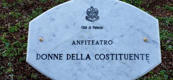 Palermo, 14 marzo 2019, una giornata ventosa ma allineate nel bordo dell’Anfiteatro del Giardino “Rosa Balisteri” spiccano le 21 targhe delle Madri della Costituente. Una grande